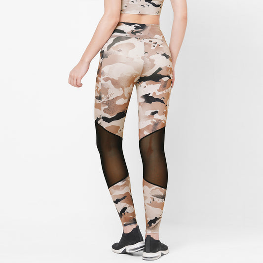 CAMEL BROWN CAMO PRINTED MESH PANEL 7/8 WORKOUT TIGHTS