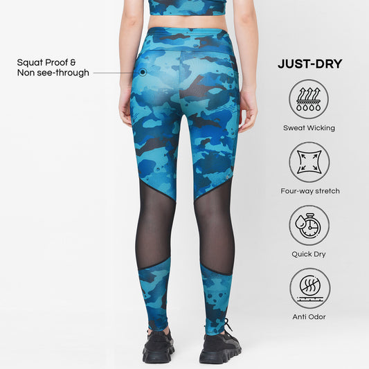 PEACOCK BLUE CAMO PRINTED MESH PANEL 7/8 WORKOUT TIGHTS