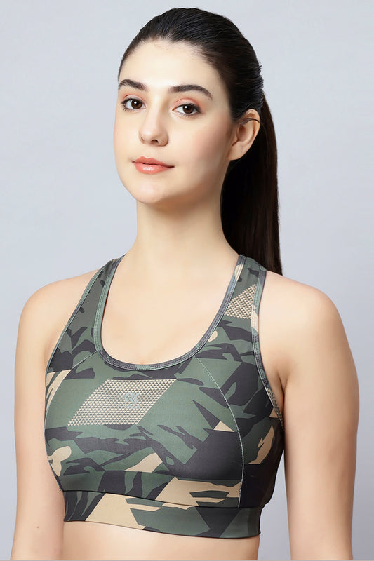 WOMEN’S CAMO PRINT SPORTS BRA WITH JUST-DRY TECHNOLOGY & RACER-BACK DESIGN