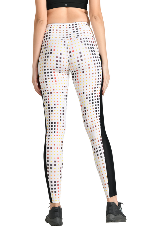 WOMEN'S MID-RISE SKINNY FIT WORKOUT PANTS WITH DIGITAL MULTI-BOX PRINT & MESH PANELS