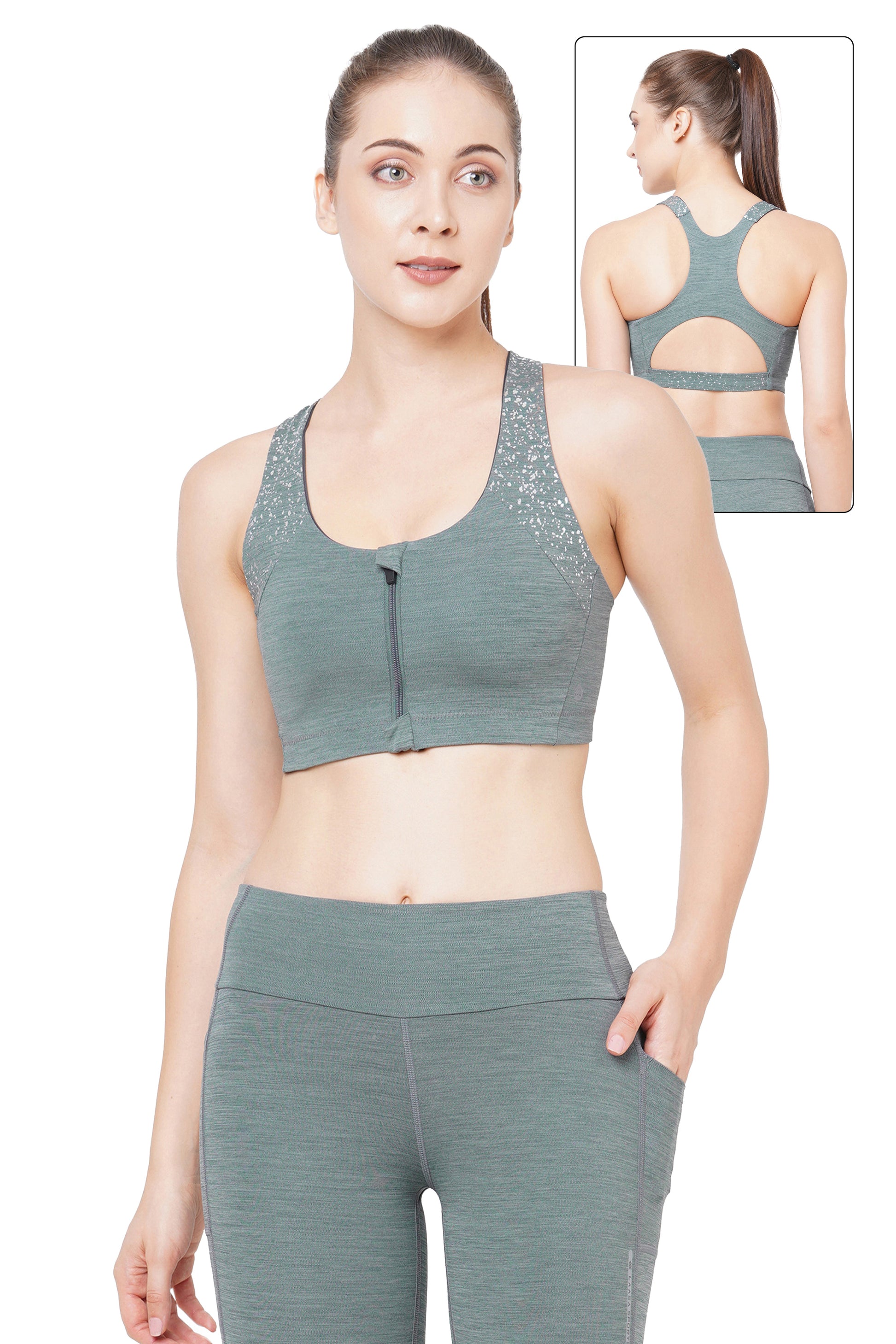 HIGH IMPACT FRONT ZIP SILVER FOIL PRINT SPORTS BRA