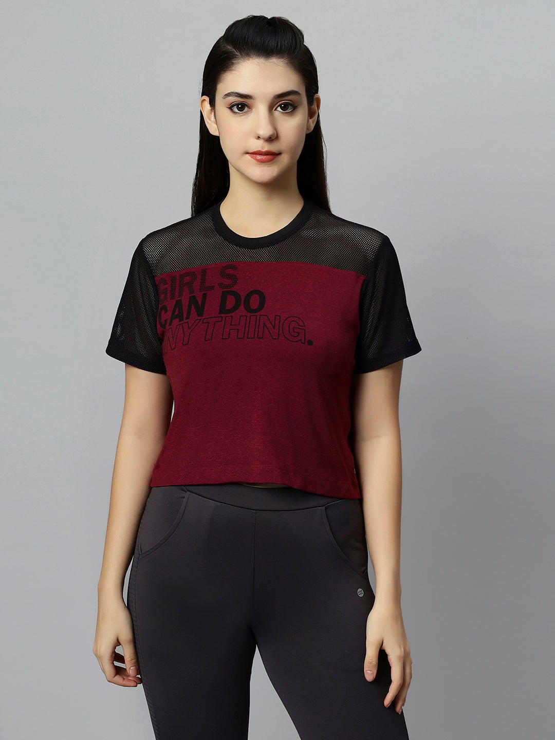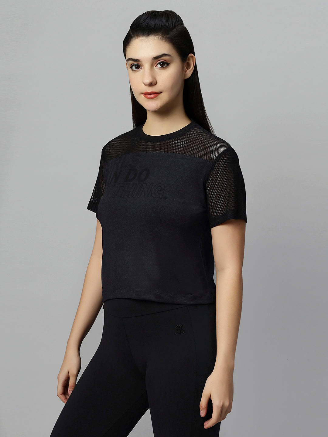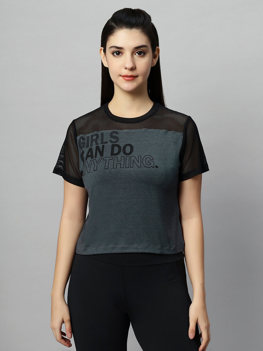 Keep it effortless and carefree in this Mesh crop top. Its poly melange fabric is lighter than fleece but still feels extraordinarily soft and comfy. Featuring Soft mesh on the shoulder and sleeves, water text print on bust and a straight hemline.